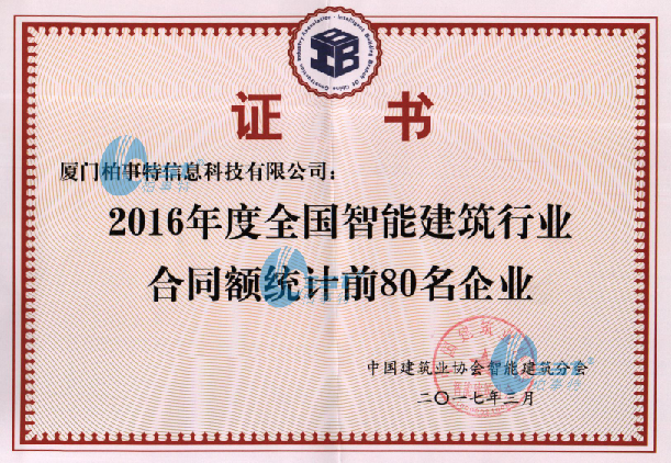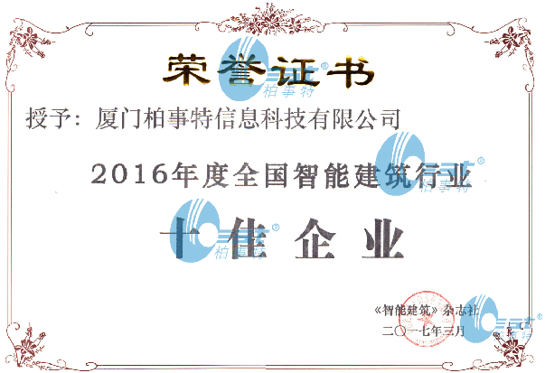 在2016年度全国智能建筑行业颁奖盛典上,柏事特在众多参评企业中脱颖而出,荣获全国行业十佳及80强企业。从最初的50强评选,到60强评选,再到80强评选,柏事特见证了智能建筑行业的飞速发展,并连续10年蝉连此项荣誉,这也是行业领导、专家、和众多用户对柏事特的充分肯定。