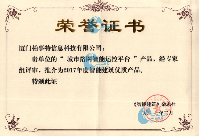 “2017中国国际智能建筑展览会”是住建部在智能建筑领域唯一重点打造的国际级专业盛会,柏事特相关智能建筑产品凭借良好的性能、广泛的市场应用,获得专家和参会人员的好评,其中“城市路网智能运控平台”还荣获智能建筑行业优质产品。